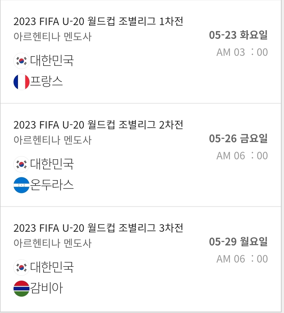 김은중 감독이 지휘하는 대한민국은 F조에 속해 있으며 한국시간 기준 5월 23일 새벽 3시 프랑스전을 시작으로 5월 26일 새벽 6시 온두라스와 2차전, 5월 29일 월요일 새벽 6시 감비아와 예선 최종전을 가집니다.